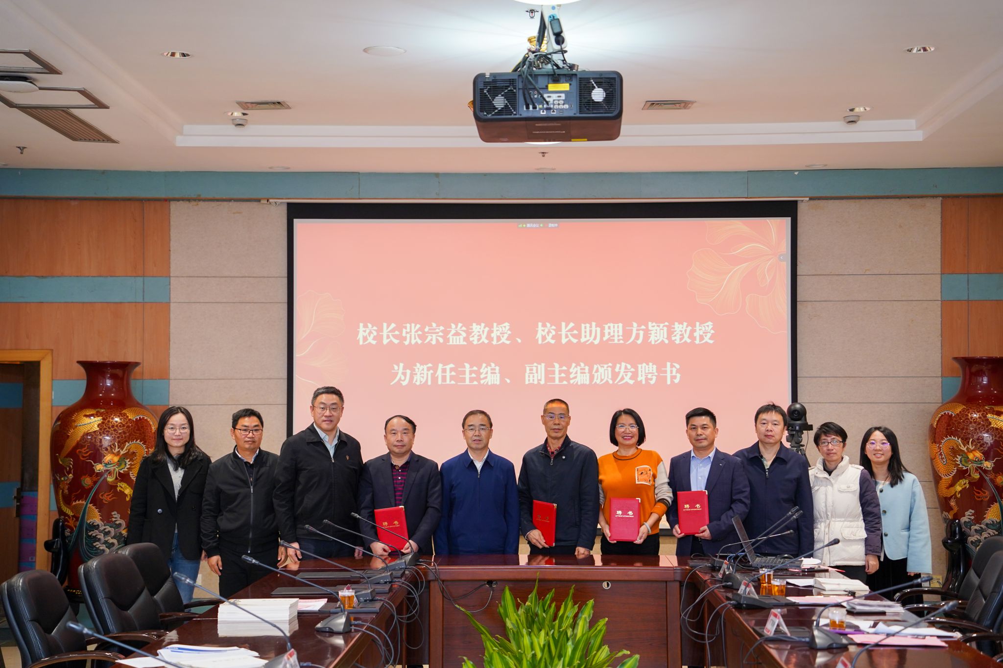 方颖宣读《厦门大学学报(哲社版)》新一届编委会成员名单,张宗益代表学校为新任主编、副主编颁发聘书。《厦门大学学报(哲社版)》新一届编委会由25位编委组成,编委会主编陈振明,副主编高和荣、何丽新、彭水军。