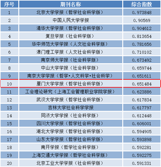 2023年,《厦门大学学报(哲学社会科学版)》转载指数在高等院校主办综合性学报中排第10位。