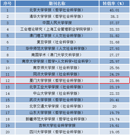 2023年,《厦门大学学报(哲学社会科学版)》转载率为23.86%,在高等院校主办综合性学报中排第12位。
