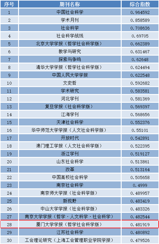 2023年,《厦门大学学报(哲学社会科学版)》转载指数在综合性期刊中排第28位。