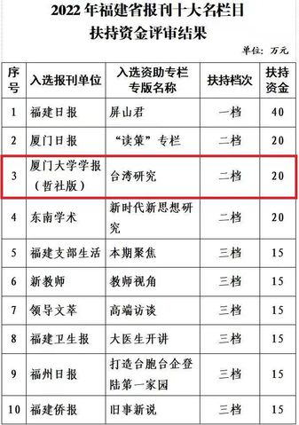 近日,福建省新闻出版局公布2022年福建省报刊十大名栏目扶持资金评审结果,我刊《台湾研究》栏目入选,获得二档资助20万元。