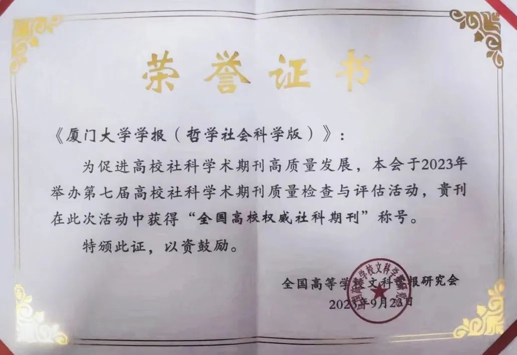 2023年9月23—24日,全国高等学校文科学报研究会九届三次理事会会议在湖北宜昌举行,会上公布了第七届高校社科学术期刊质量检查与评估结果,《厦门大学学报(哲学社会科学版)》获评文科学报最高奖项“全国高校权威社科期刊”。